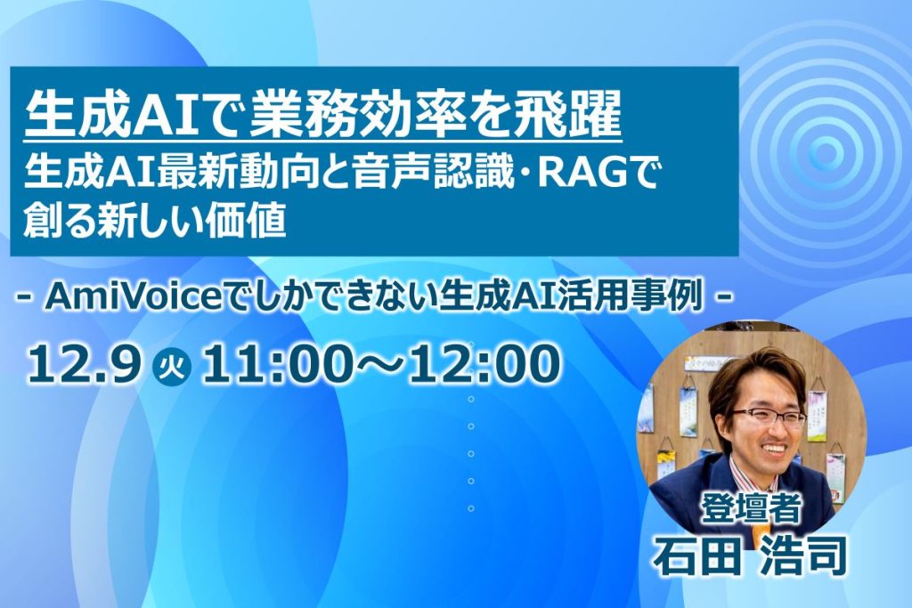 アクロクエストテクノロジー株式会社(本社:神奈川県横浜市、代表取締役:新免流、以下、アクロクエスト)のシニアソリューションアーキテクト 石田 浩司は、2025年12月9日(火)に株式会社アドバンスト・メディアが開催する無料オンラインセミナー 「生成AIで業務効率を飛躍 〜生成AI最新動向と音声認識・RAGで創る新しい価値〜」 に登壇します。