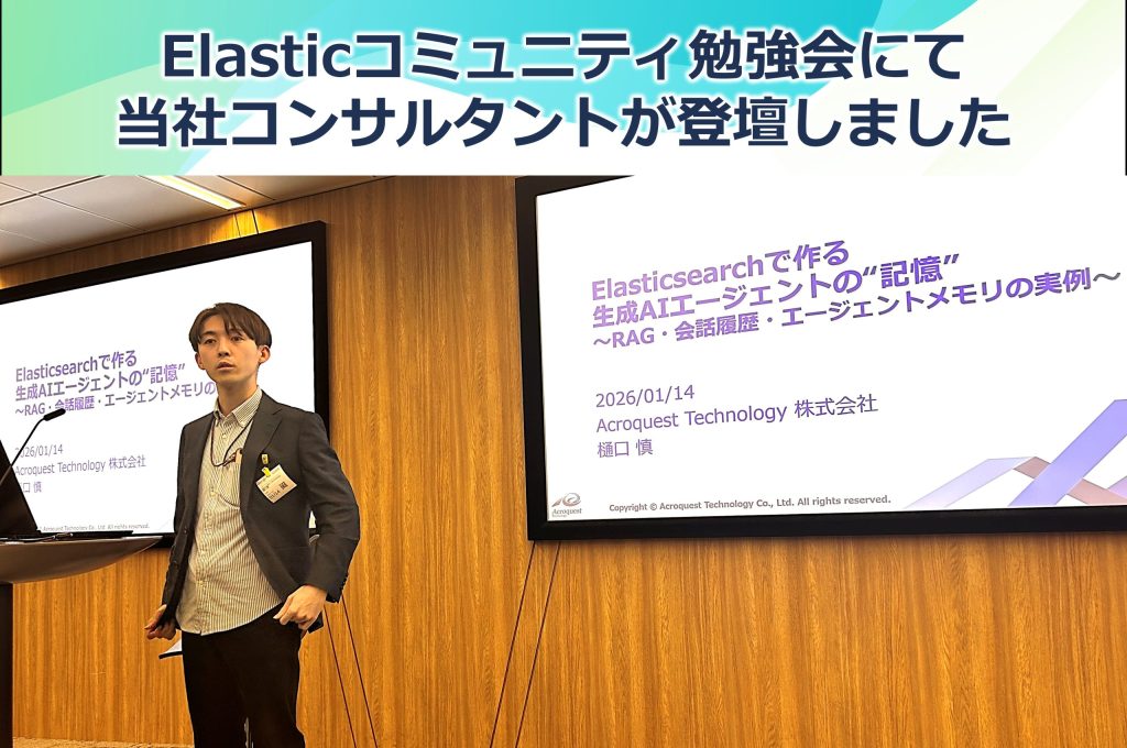 アクロクエストテクノロジー株式会社(本社:神奈川県横浜市、代表取締役:新免流、以下、当社)のElasticコンサルタント 樋口慎は、2026年1月14日(水)に東京で開催されるElasticコミュニティ勉強会 「Elastic コミュニティ・リコネクト — 検索、ログ、そしてAI」 にて登壇しました。
