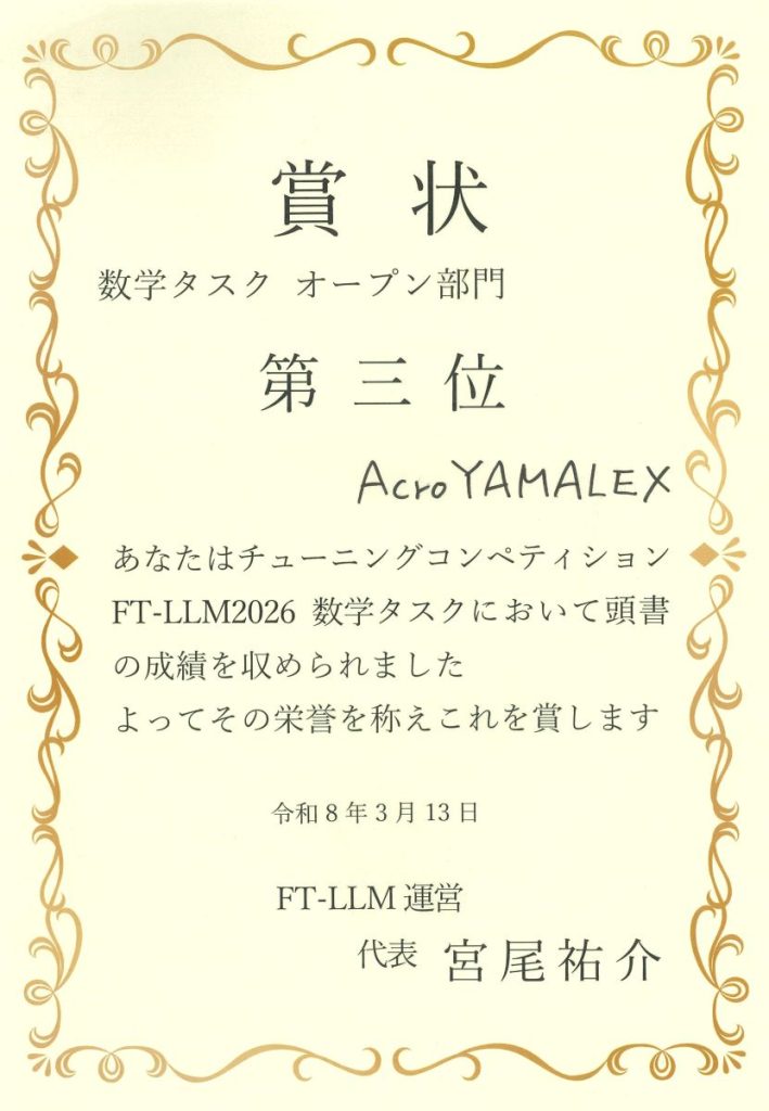 当社の最先端技術研究チームである「YAMALEX」は、この大会にチームとして参加し、全24チームが参加する中で、数学タスク部門 第3位を受賞しました。